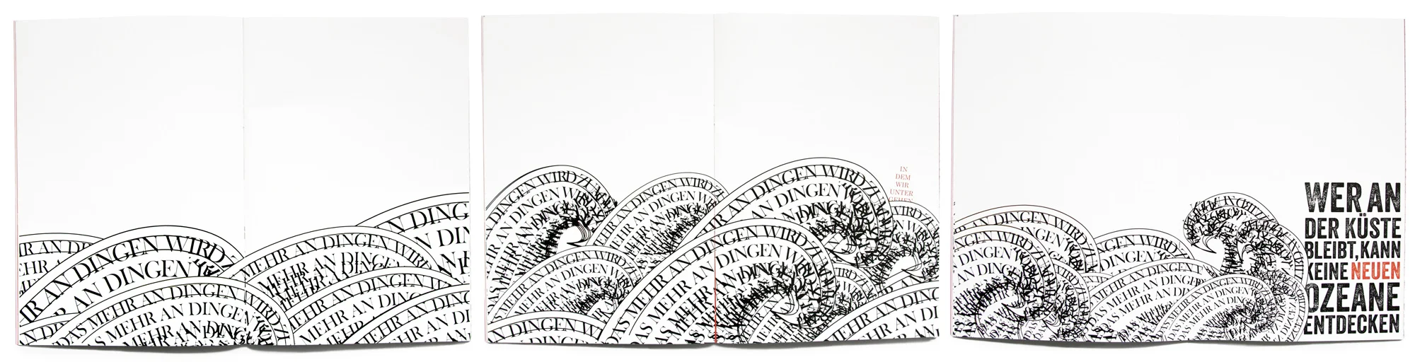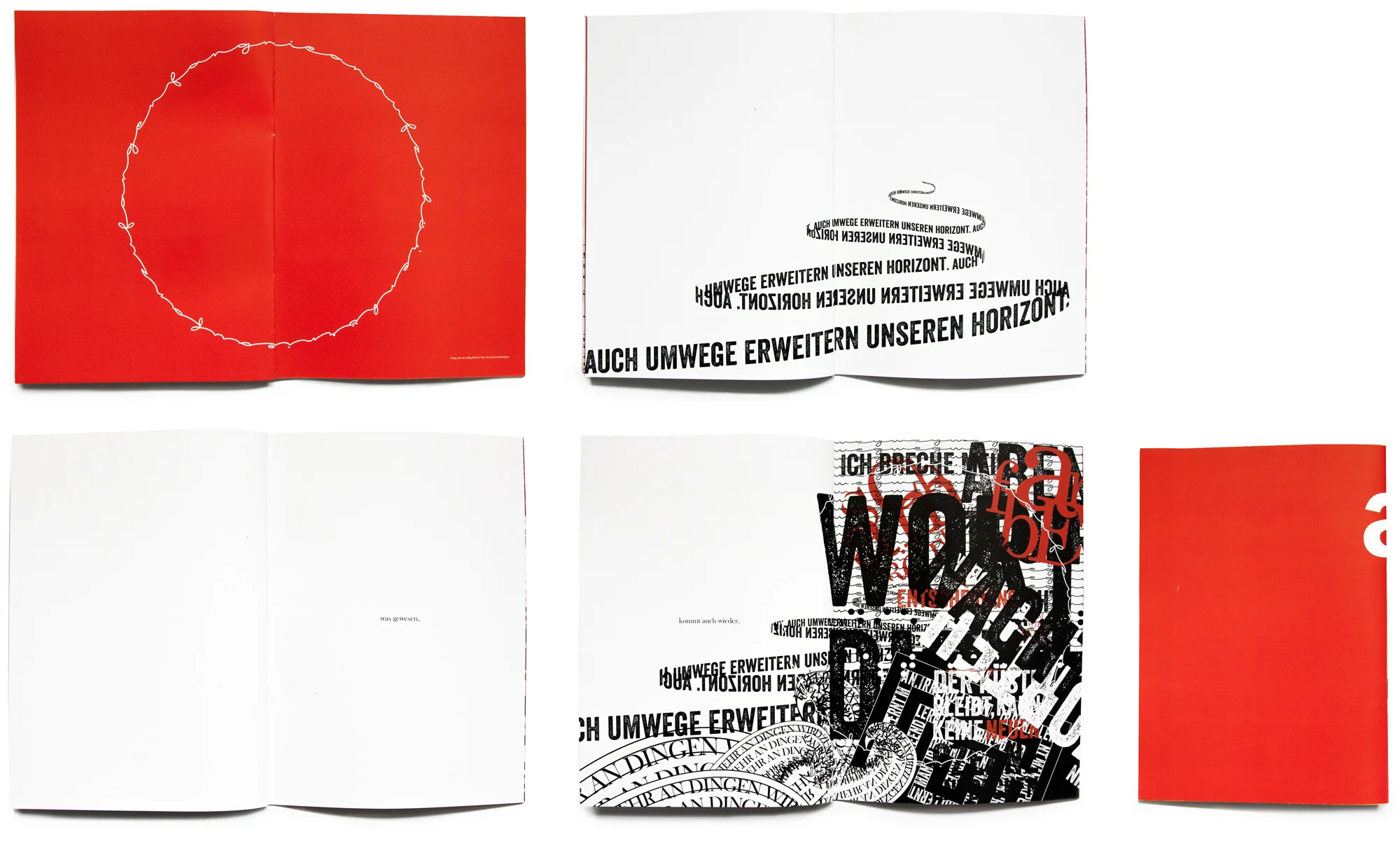 Ich habe mich für dreizehn Aphorismen entschieden, die thematisch teilweise sehr unterschiedlich waren, mir jedoch die Möglichkeit gegeben haben, verschiedene gestalterische Methoden auszuprobieren, wie beispielsweise die Verwendung von verschiedenen Schriftgrößen und -dicken, von Blindenschrift und von einfachen Formen oder durch Wiederholungen enstehende Formen.